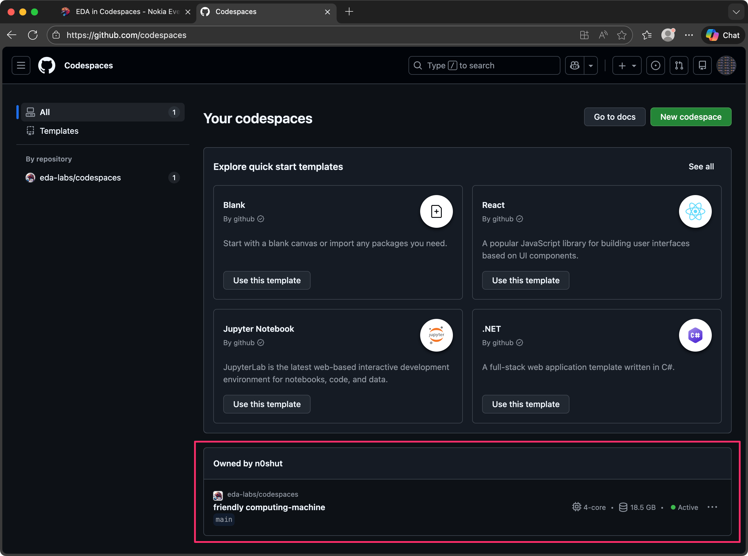 The panel shows you all your existing Codespaces environments and their status. In the screenshot above there is one environment created from the eda-labs/codespaces repository, which is currently active (running).