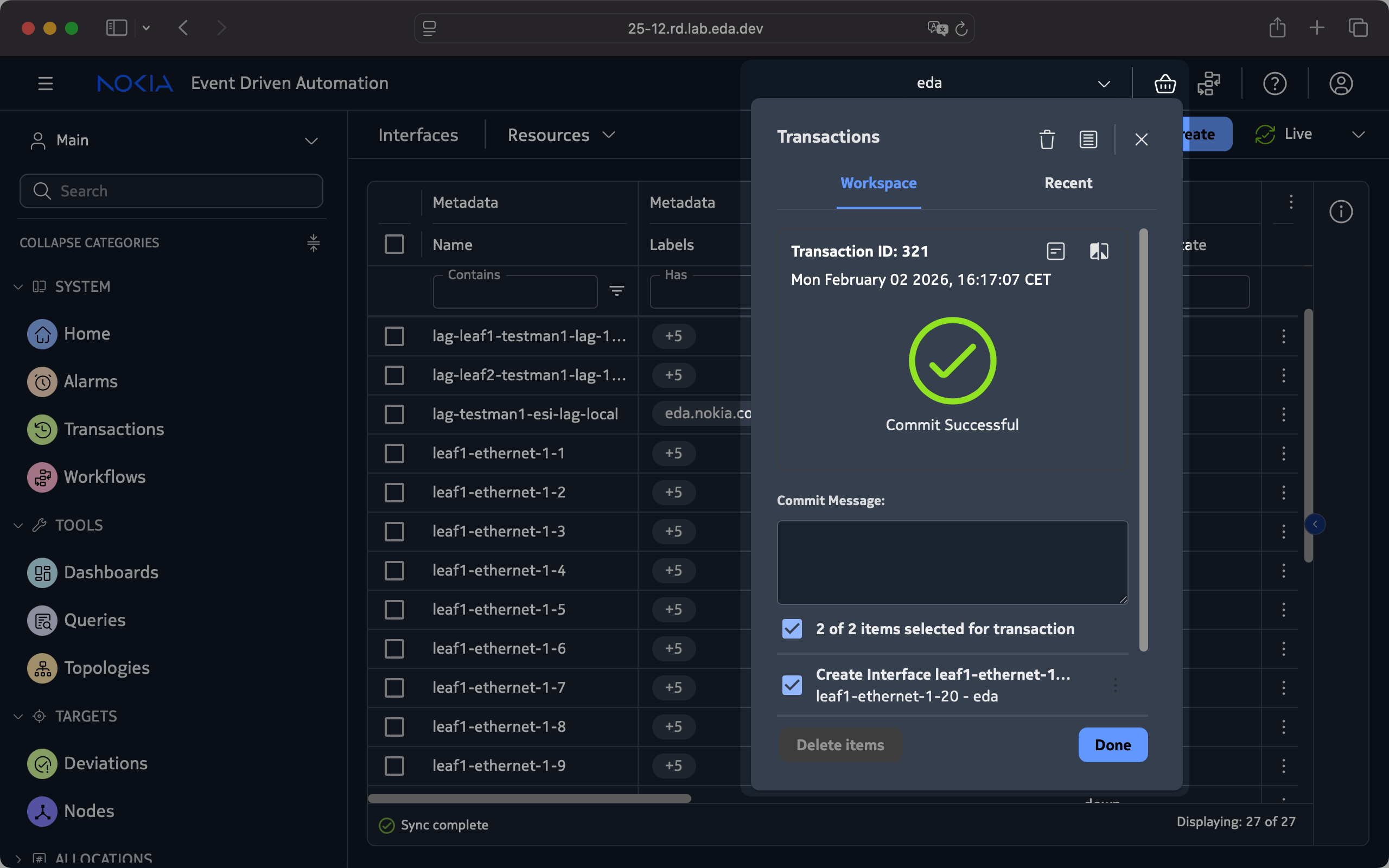 The commit process will look similar to the dry run, however, this time EDA will proceed with pushing the changes to the target devices using the Network-wide Transactions mechanism described earlier.