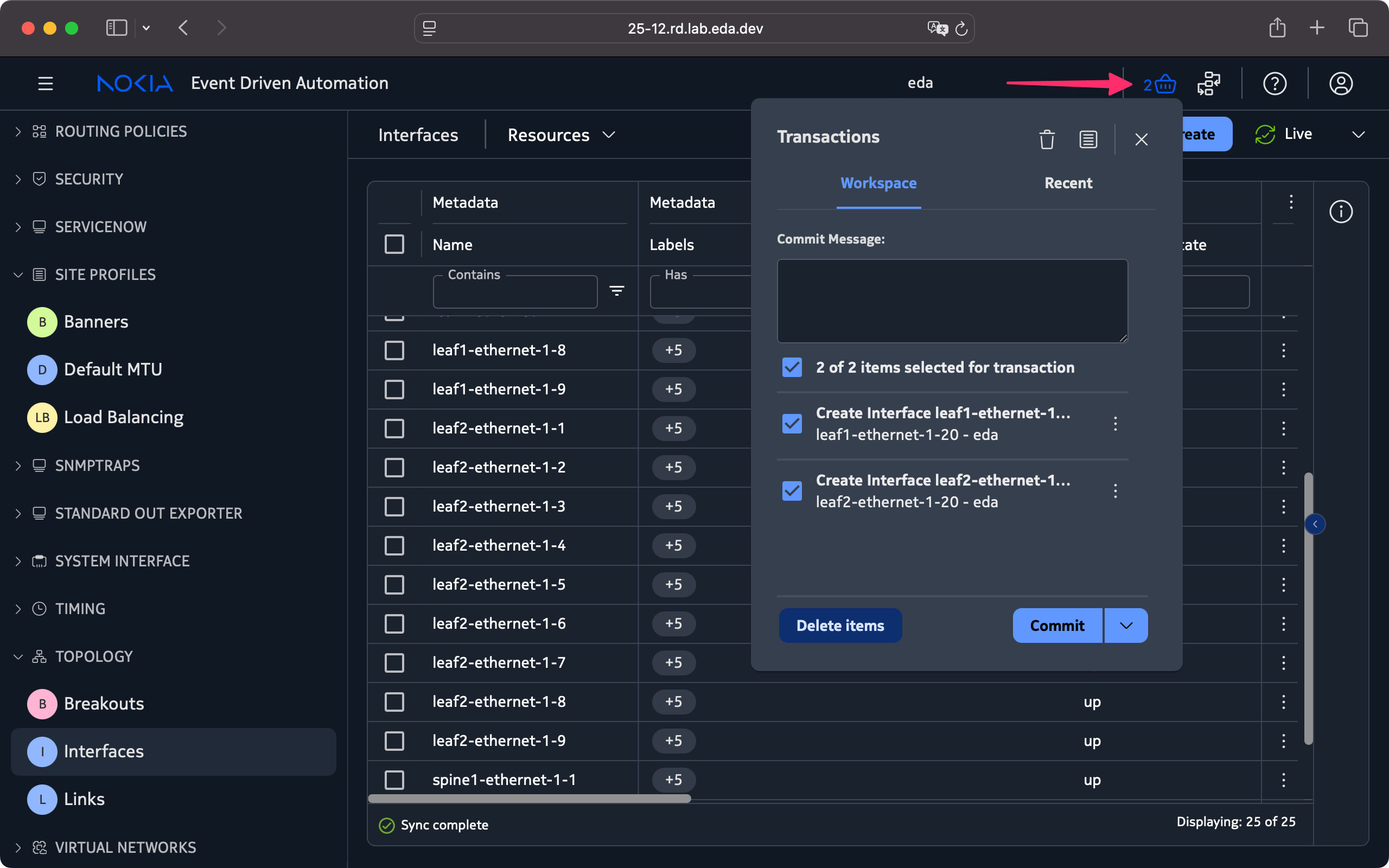 After adding both interfaces to the transaction basket, you should see the counter next to the basket icon in the top right corner of the EDA UI indicating that there are two staged resources waiting to be committed. Clicking on the basket icon will open the transaction basket popup where you can review the staged resources, perform operations on them (edit, delete), or proceed with transaction operations.