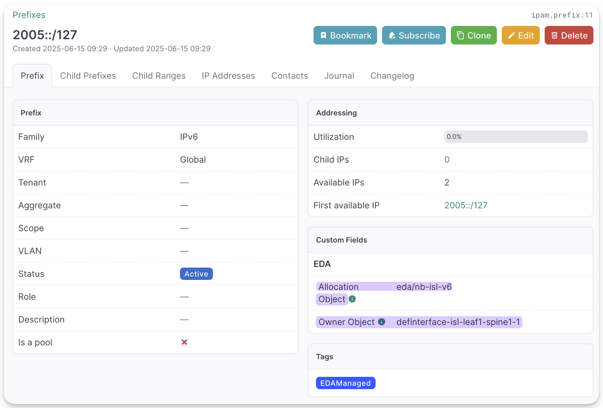 We create the eda-isl-v6 tag first and then the Prefix 2005::/64 with the Status=Container and this tag assigned.