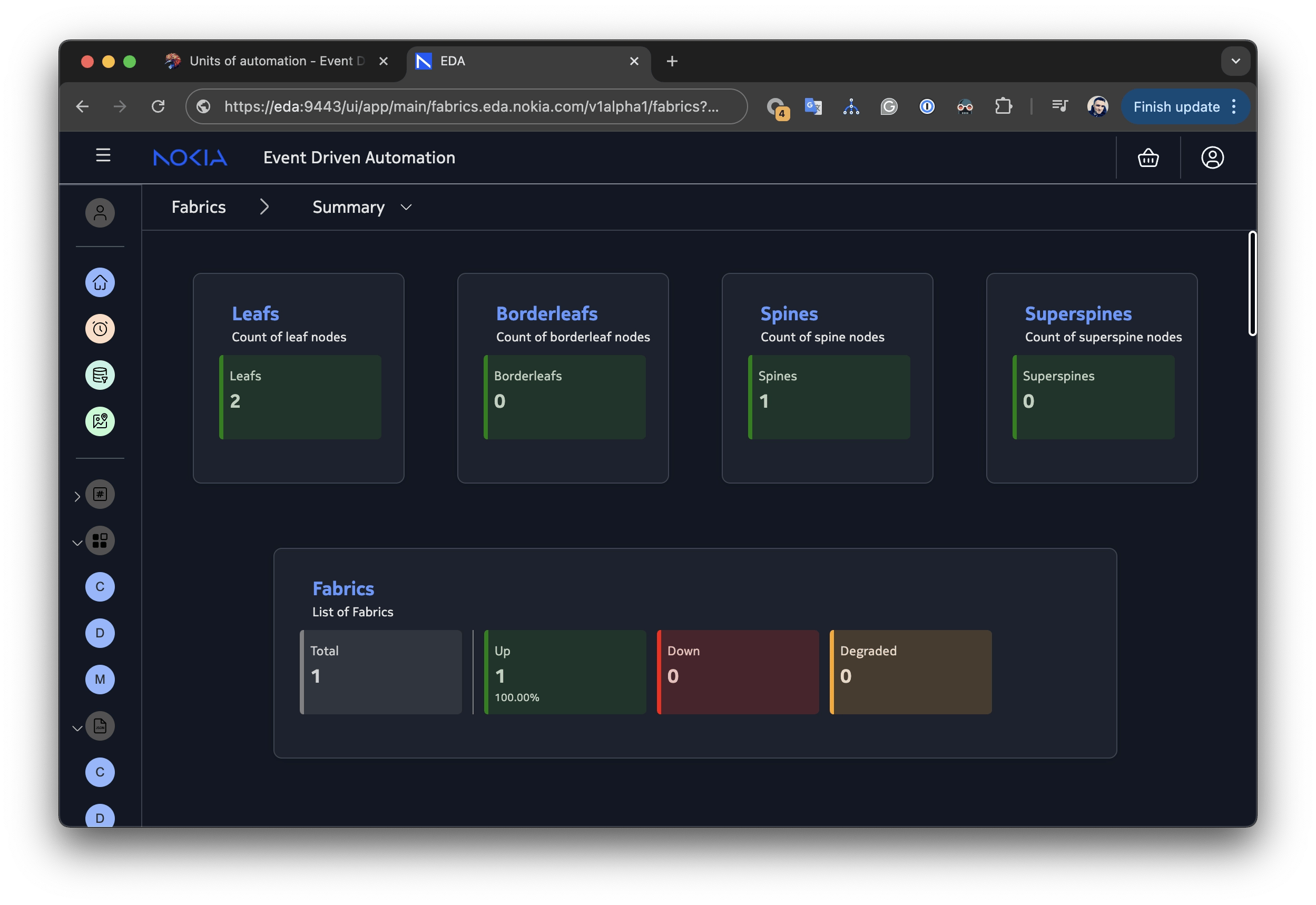 In EDA, the application developer can define the rules to calculate the state of a resource and populate the resource with this information. By looking at the Fabric's state field an operator can confidently determine the health of the Fabric, without having to inspect the configuration of every single node.