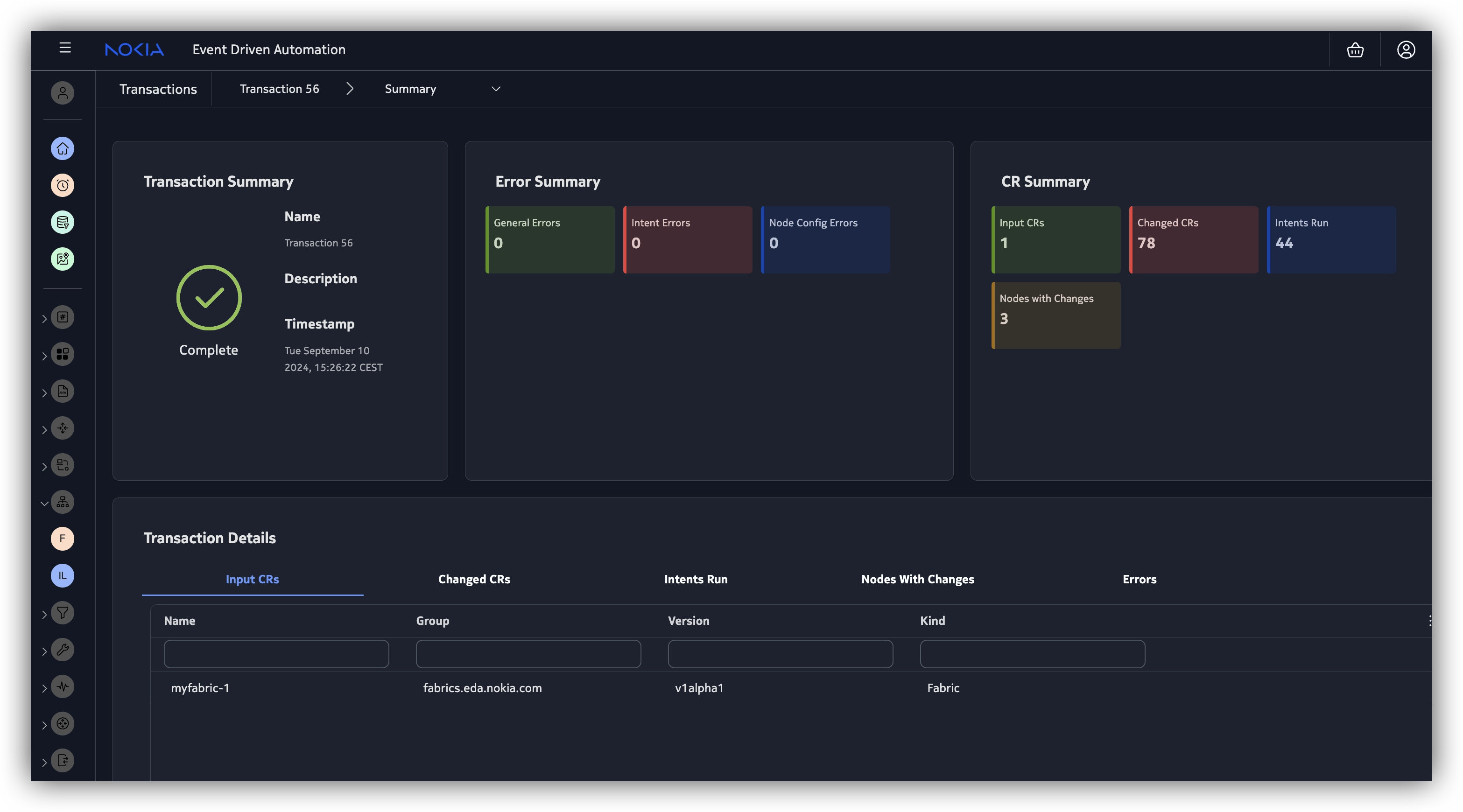 You will see a lot of details, some of them we clipped from the output to keep it short, but essentially the transaction logged the input resource (kind=Fabric name: myfabric-1) and the output products of this resource being created (output-crs). Each of these outputs constitute a Fabric resource.
