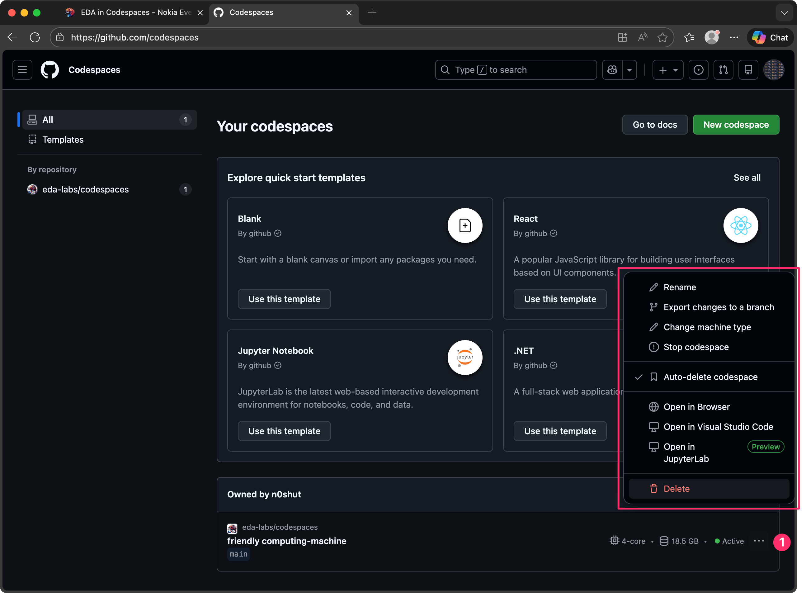 The panel shows you all your existing Codespaces environments and their status. In the screenshot above there is one environment created from the eda-labs/codespaces repository, which is currently active (running).