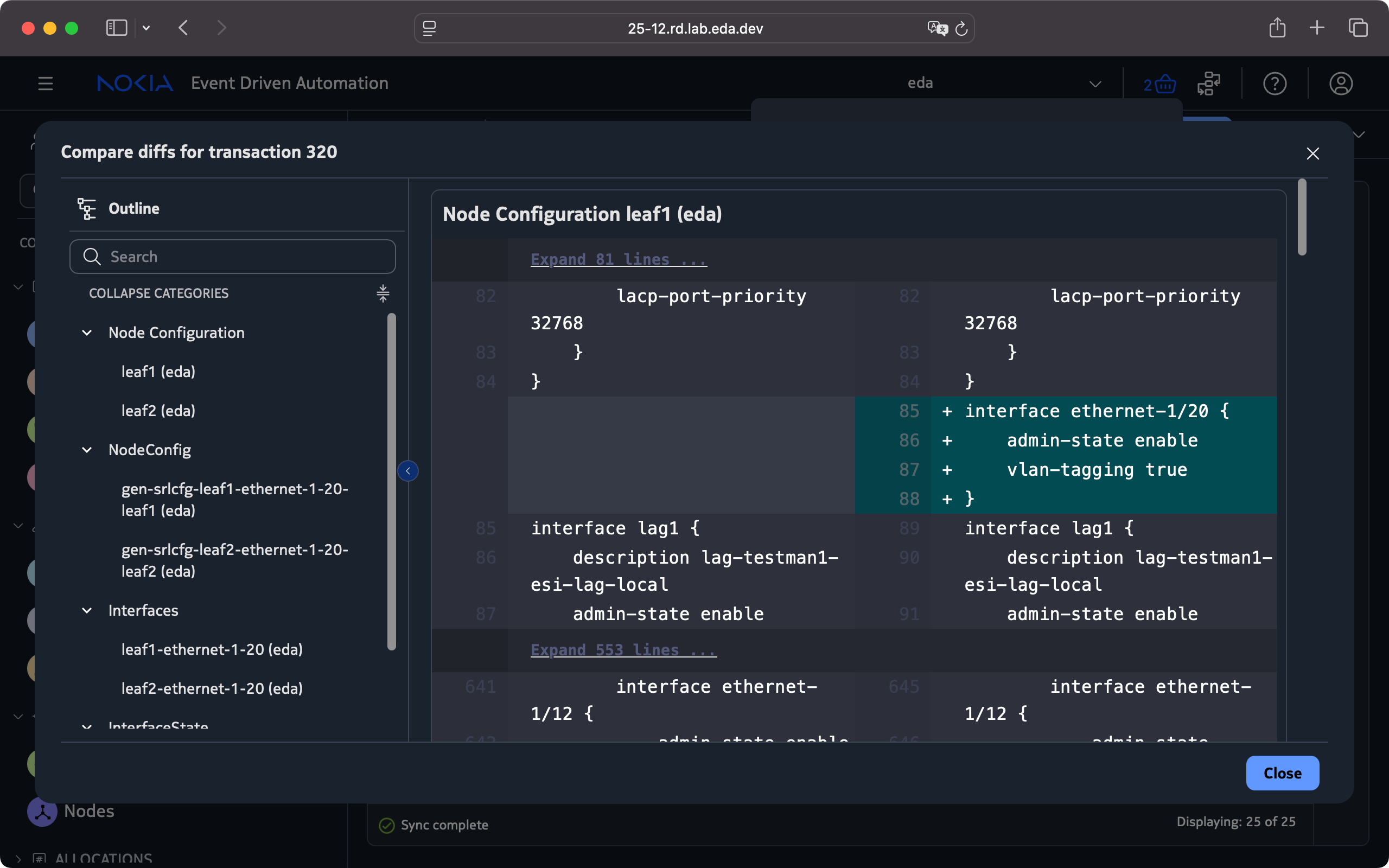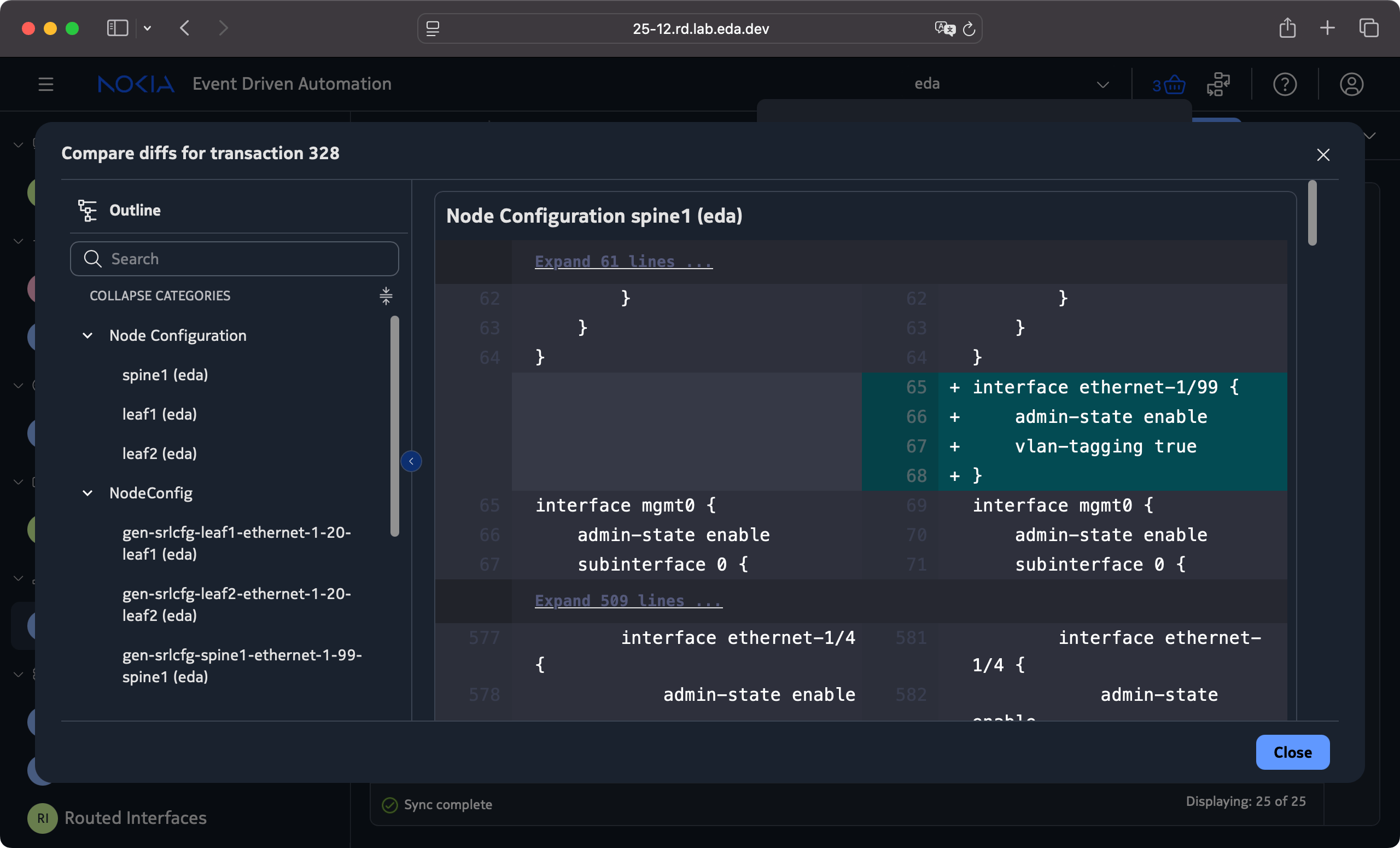 The "Node Configuration" diffs are always at the top of the list as they represent the actual configuration changes that will be applied to the target devices. In our case, we have two new interfaces being created on leaf1 and leaf2 nodes respectively, and the diff shows the exact configuration snippets that will be added (in this case) to the running configuration of each device.