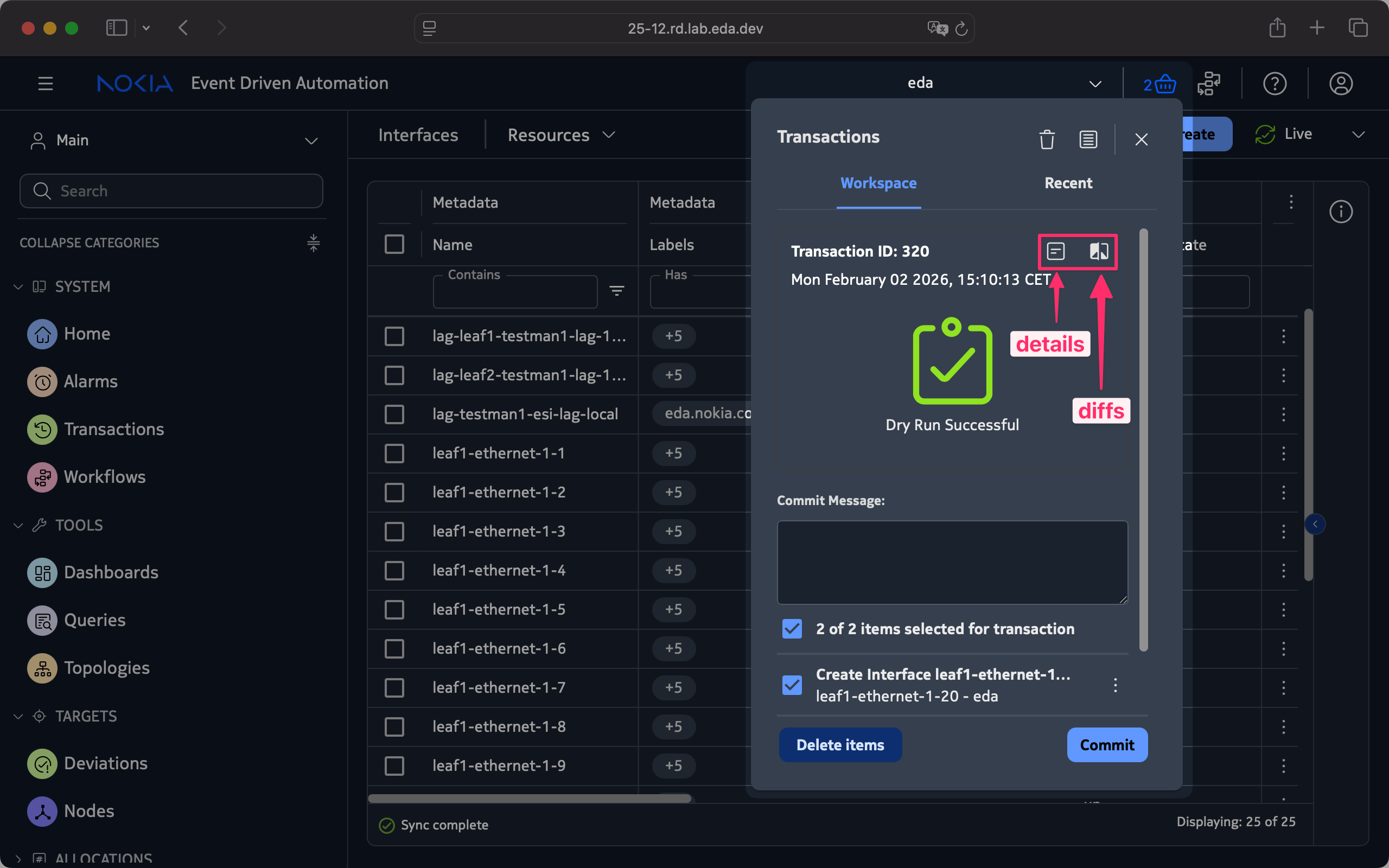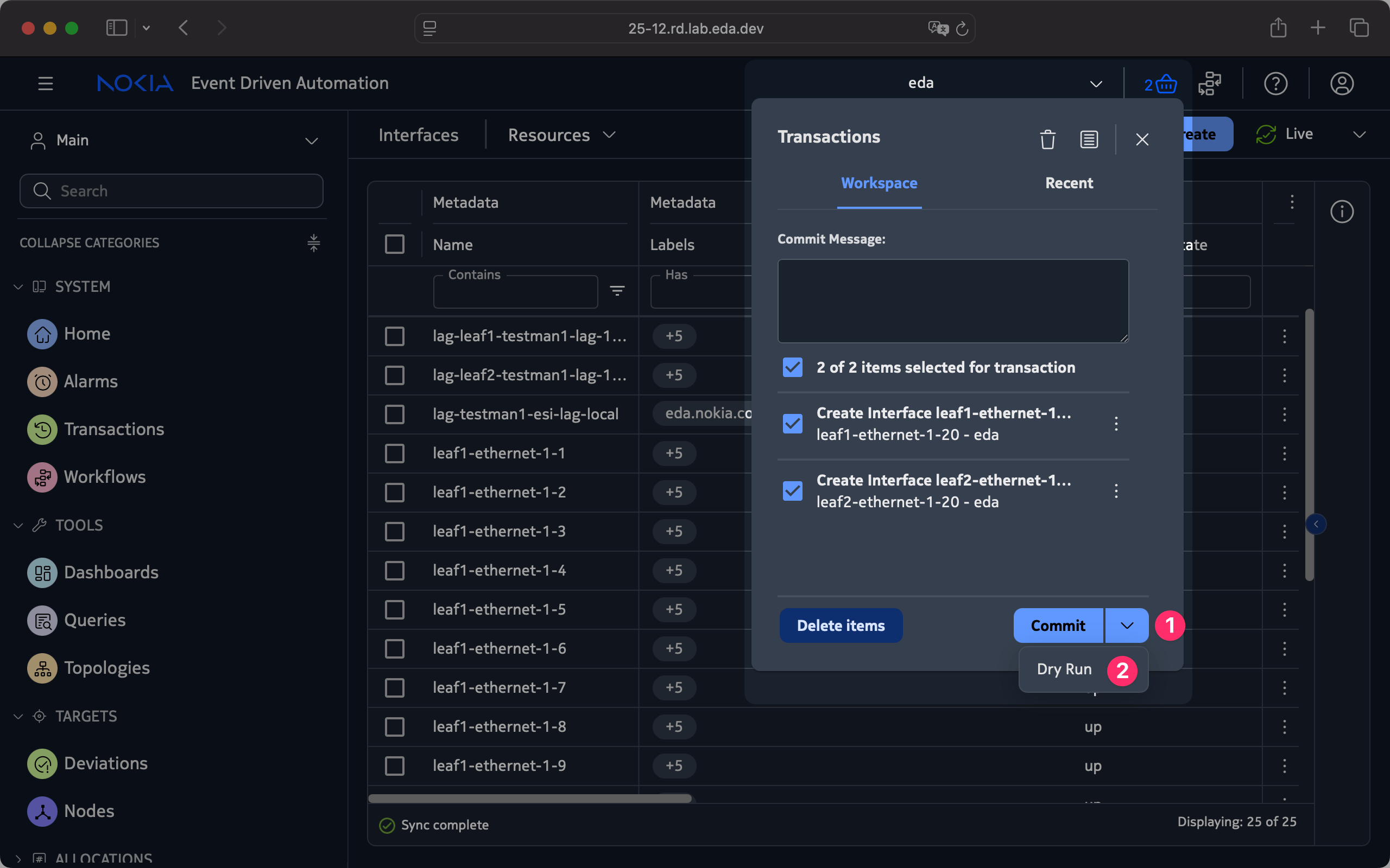 Acknowledging this fact, EDA provides a "Dry run" feature that allows operators to preview the changes that would be applied to the network without actually applying them. This is a great way to validate the intended changes before committing them to the network.