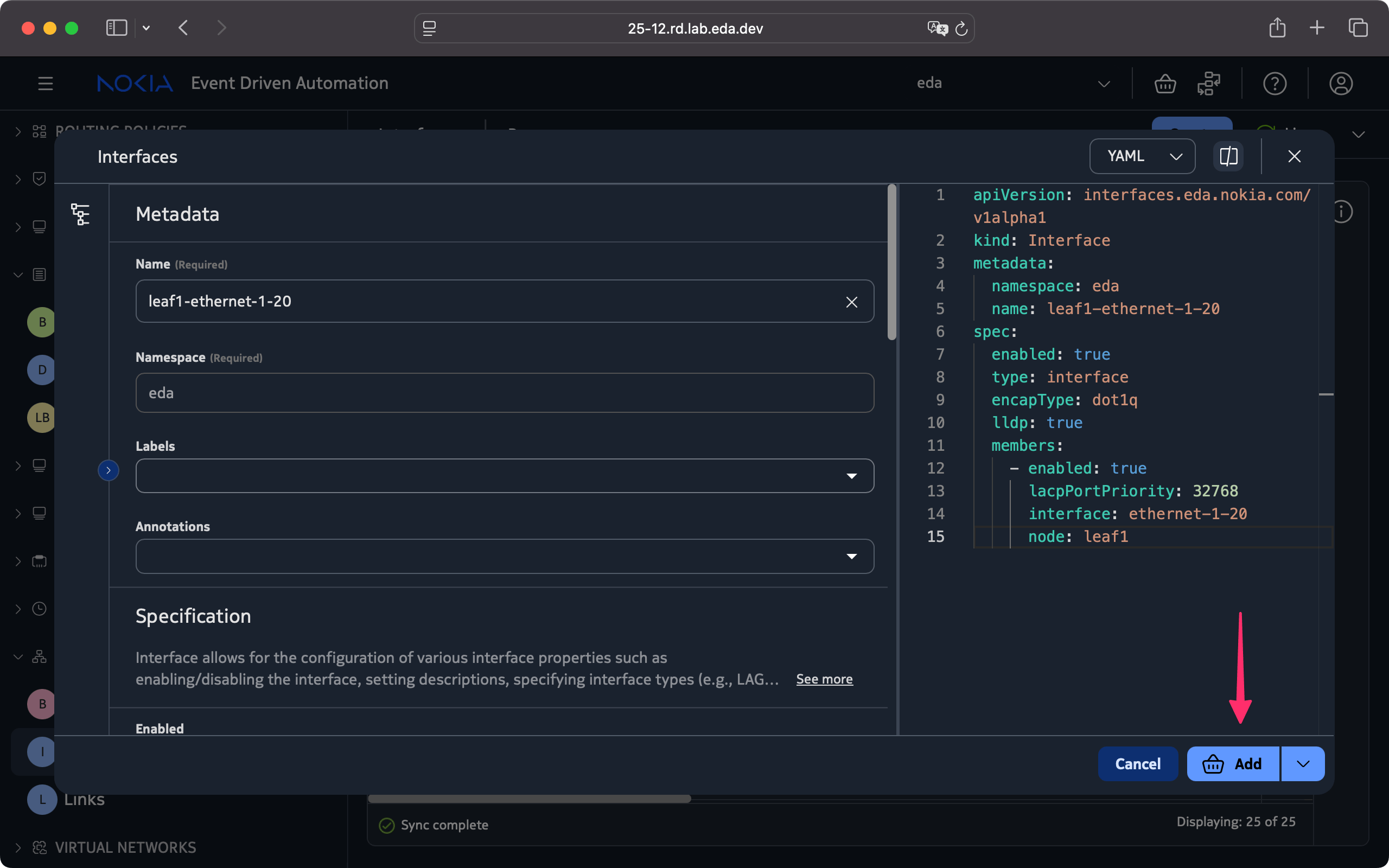 After pasting the YAML snippet or filling the schema form, click on "Add" button to add the new interface resource to the transaction basket.