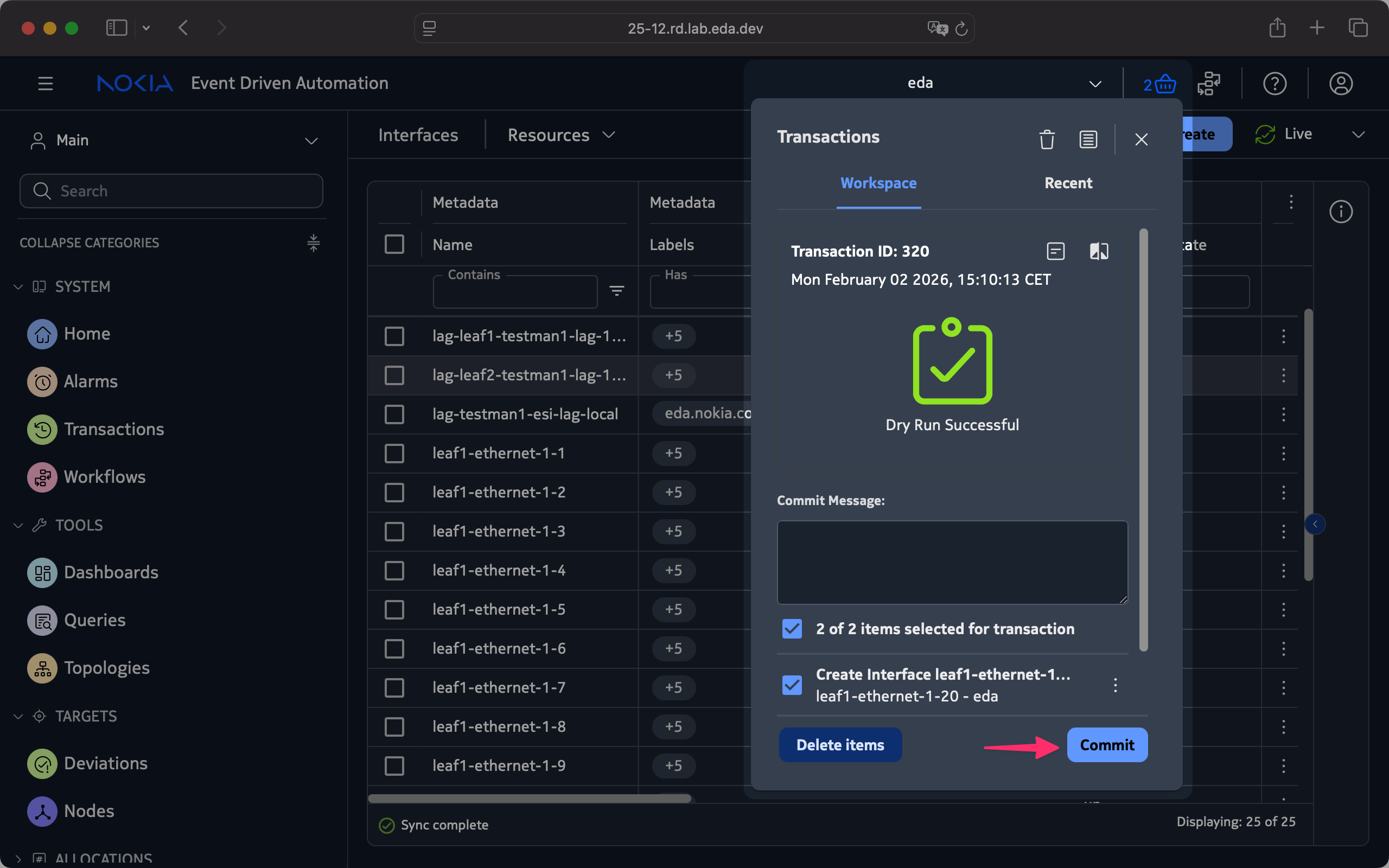 The commit process will look similar to the dry run, however, this time EDA will proceed with pushing the changes to the target devices using the Network-wide Transactions mechanism described earlier.