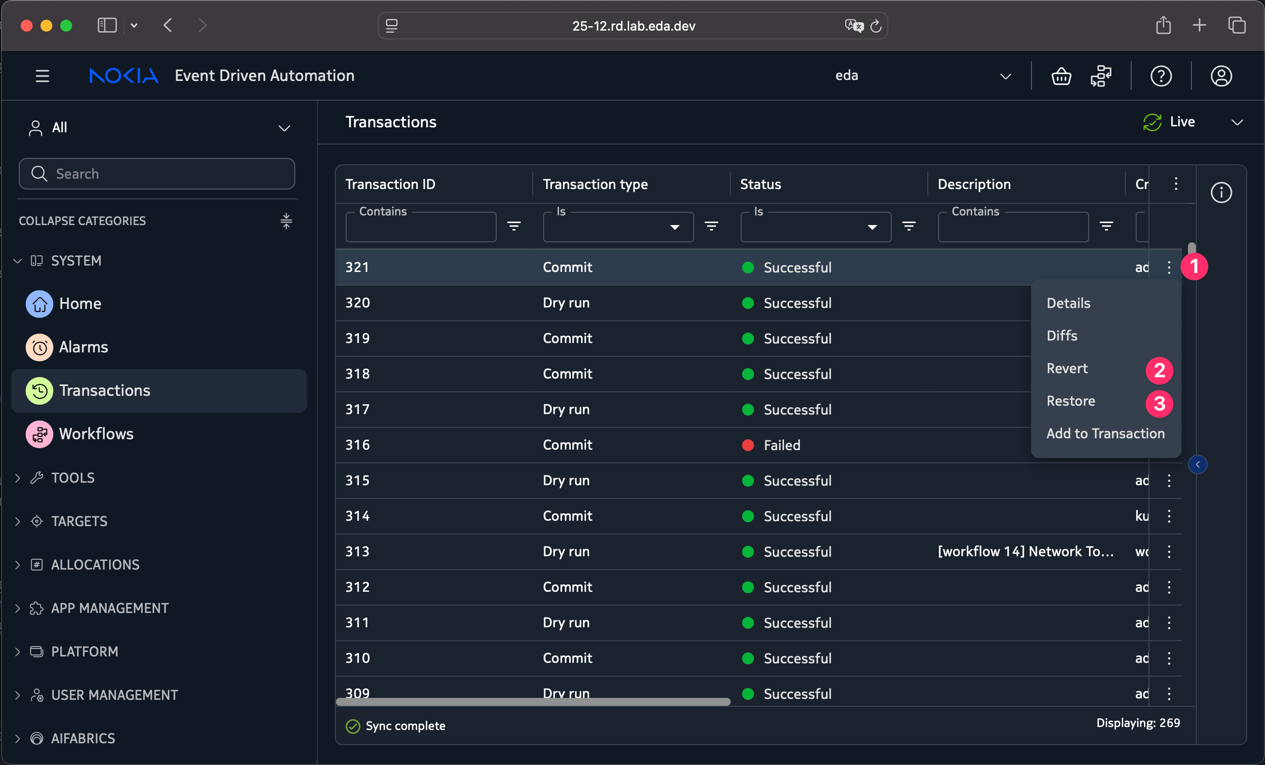 Revertsets all the input resources from a specific transaction back to the previous commit4Restoresets all EDA resources, apps, and allocations to exactly as they were at the specified commit