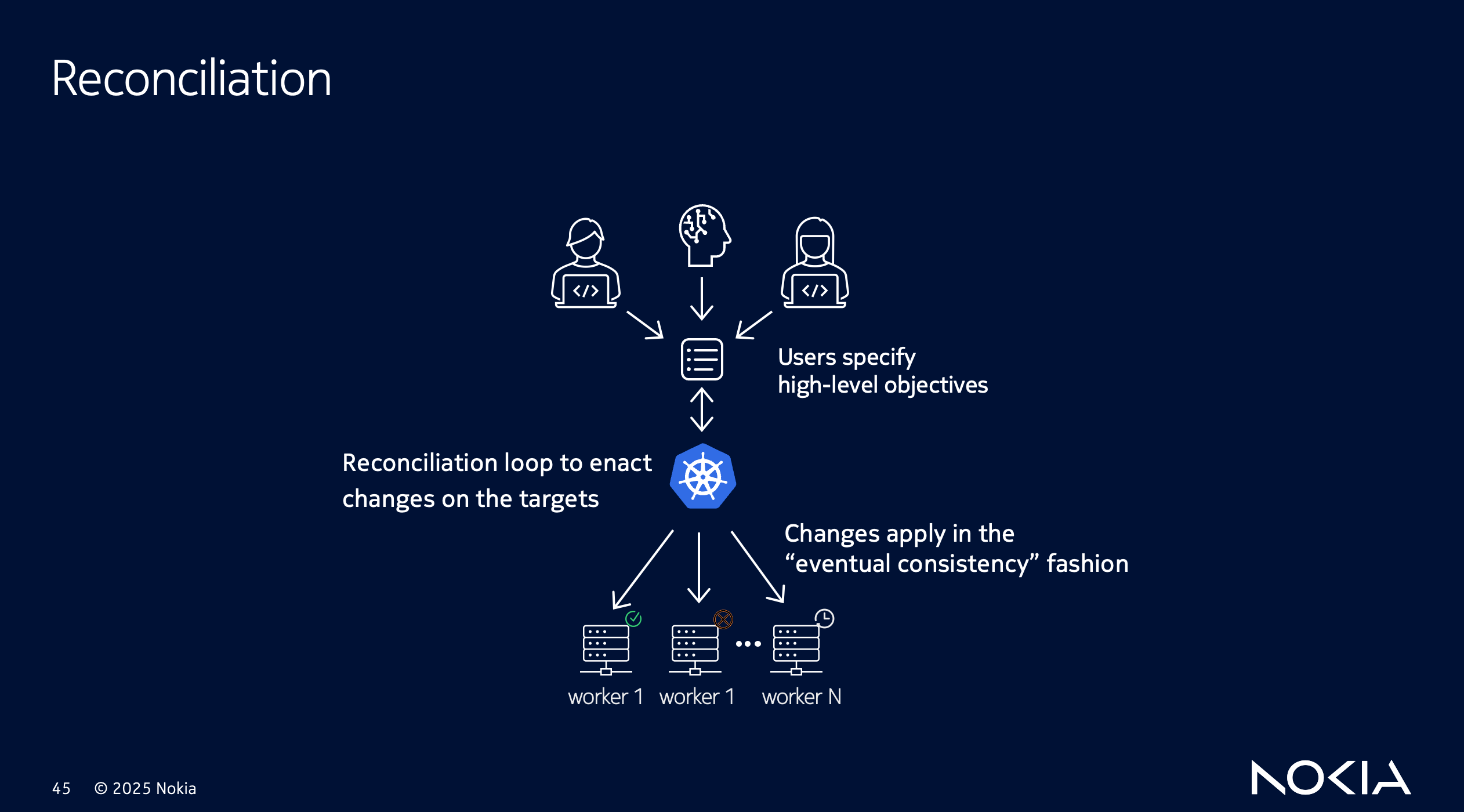 Imagine, that a user wants to deploy a web server with three replicas across the worker nodes in a Kubernetes cluster. The user would submit a manifest declaring this intent and the Operator in Kubernetes would create the necessary components to realize this intent. And eventually the actual state of the cluster would converge to the desired state.